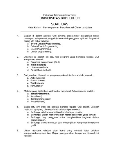 Grafika komputer, pemrograman berorientasi objek 1 a. Jadwal kuliah dan nilai yg didapat mhs dr mt kuliah yg diikutinya. Sesuai dengan nama mata kuliah tersebut maka kontennya menuntut mahasiswa untuk dapat mempraktekkannya secara nyata. Soal uts pemrograman berorientasi objek anhar panduwinata 2016 03 22t23 14 00 07 00 5 0 stars based on 35 reviews dikarenakan penulis baru saja melewati masa ujian tengah semester mata kuliah pemrograman berorientasi objek. Benny hermawan, menguasai java 2 &
