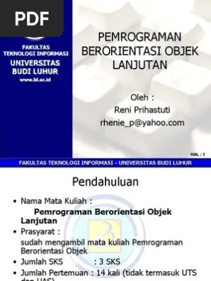 Materi Kuliah Pemrograman Berorientasi Objek : Mengenal Pemrograman Berorientasi Objek Dalam 5 Menit : Badoy studio juga sudah menyajikan beberapa materi kuliah jurusan sistem informasi, diantaranya :. Benny hermawan, menguasai java 2 & Durasi perkuliahan ± 16 minggu. Mata kuliah pemrograman berorientasi obyek merupakan mata kuliah yang baru diberlakukan pada kurikulum 2012 di program studi teknik telekomunikasi. Deskripsi singkat pada bab ini akan dijelaskan Bila dapat menjual atk antara 21 s/d 35 macam, maka mendapatkan tambahan 10% dari gaji.