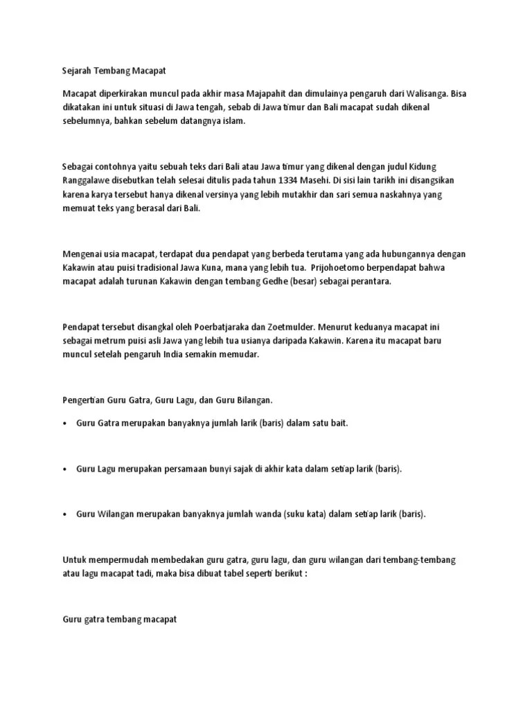 12 rows pengertian guru gatra guru wilangan lan guru lagu tembang macapat adi. Teksnya yang memuat pengertian mengenai keris dan segala unsurnya yang. Guru lagu yaiku tibaning swara ing saben pungkasaning gatra. Tembang macapat yang berjumlah sebelas dalam kebudayaan jawa mempunyai aturan (paugeran) yaitu guru gatra, guru wilangan dan guru lagu. Home artikel pengertian guru wilangan.